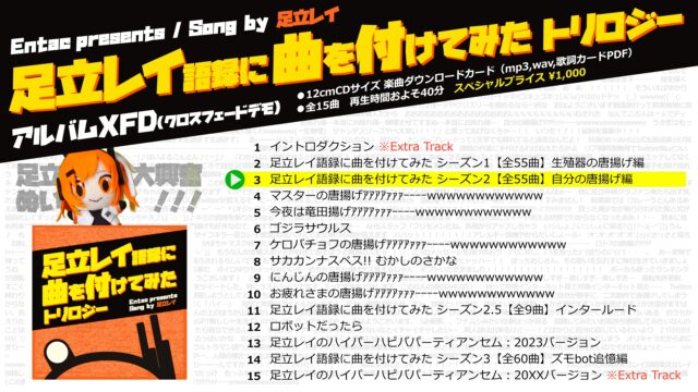 こんにちは、Entacです🔥2026年3月29日開催の「そうぞうパレッツ東京2026」に合わせ、今まで何気に存在していなかった、 Entac制作の過去の頒布物の個別記事を作ってみました。「足立レイ語録に曲を付けてみた トリロジー」概要足立レ.....